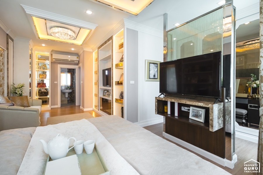 จากภาพผนังฝั่งซ้ายสามารถ Buit-in เป็นตู้เสื้อผ้าบานใหญ่สูงจรดฝ้าได้ ช่วยเพิ่มพื้นที่ในการเก็บของได้มากยิ่งขึ้น