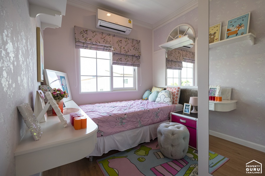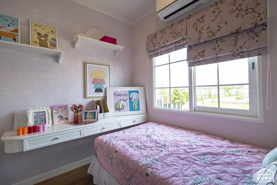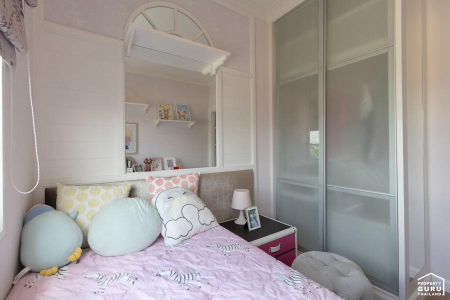 ตกแต่งเป็นห้องสำหรับเด็ก มีหน้าต่างบานเลื่อนให้ 1 บาน วางเตียงได้ขนาด 3.5 ฟุต