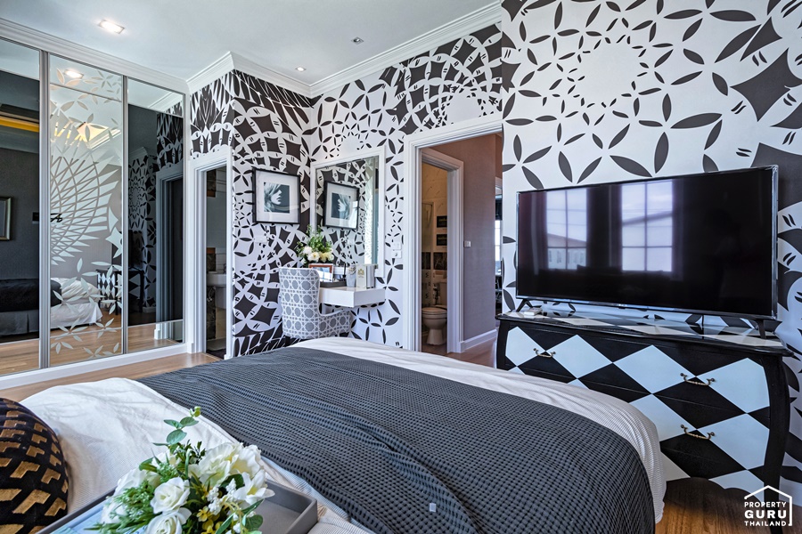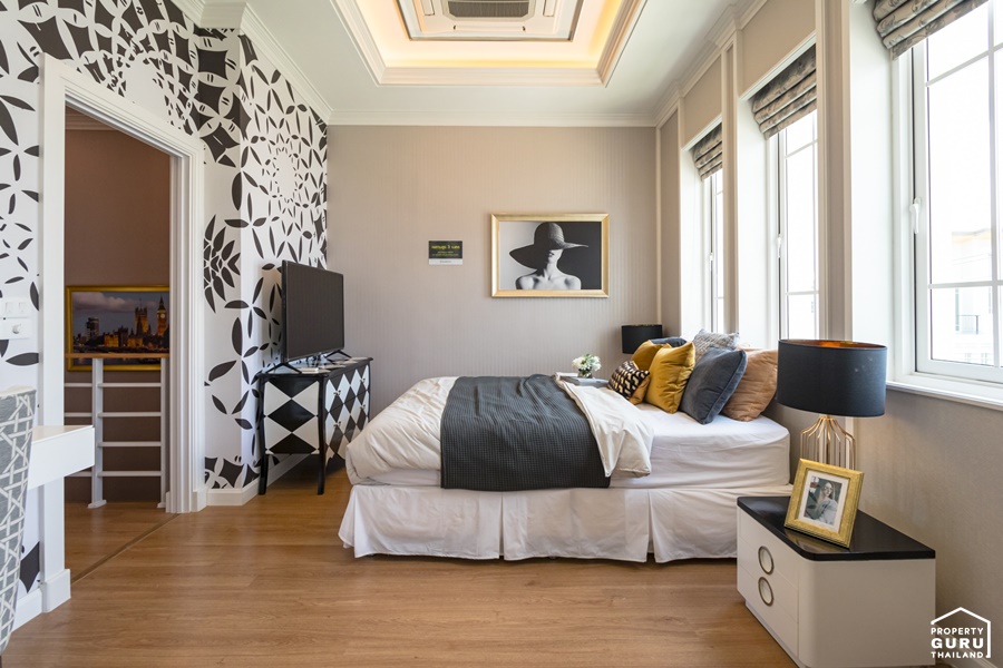 ห้อง Master Bedroom จัดวางไว้ฝั่งหน้าบ้าน โดดเด่นด้วยเพดานห้องที่สูงถึง 3 เมตร ทำให้ห้องดูโปร่ง