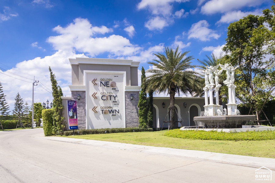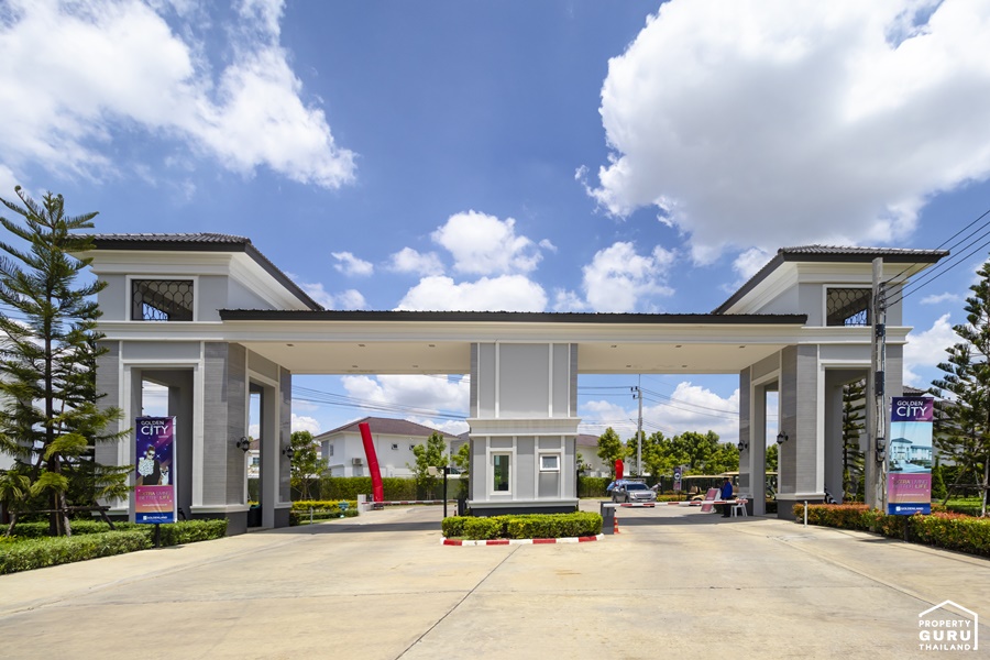 ฝั่งขวามือของซุ้มประตูทางเข้าโครงการ มีป้ายชื่อโครงการ Golden City Sathorn มองเห็นได้ชัดเจน