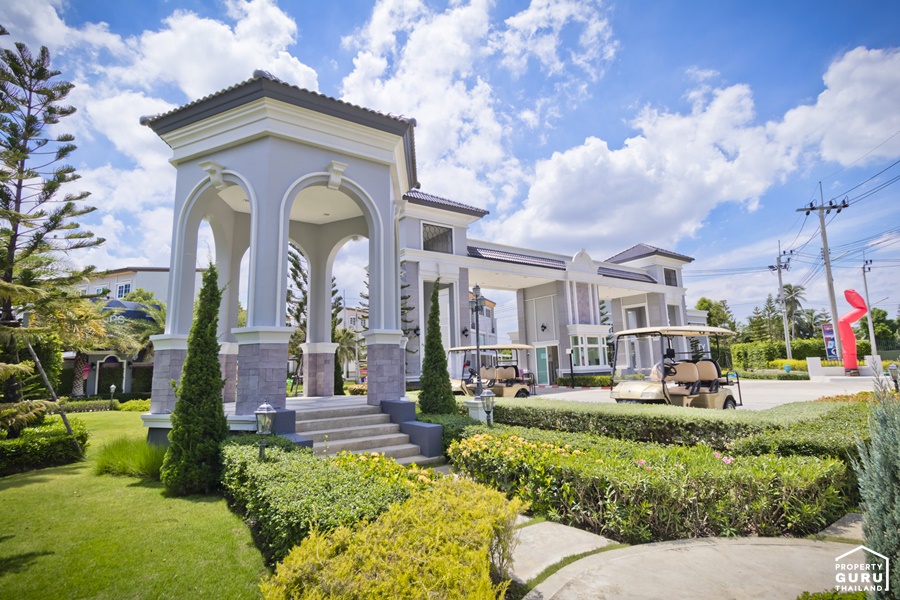 บรรยากาศด้านหน้าคลับเฮ้าส์หรูสไตล์อังกฤษ ซึ่งในปัจจุบันใช้เป็น Sales Office หรือสำนักงานขาย