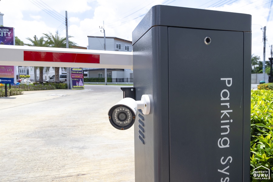 ทางเข้า-ออก มีไม้กั้นกระดก พร้อมกล้อง CCTV 3 ตัว สำหรับจับภาพป้ายทะเบียนรถ 1 ตัว