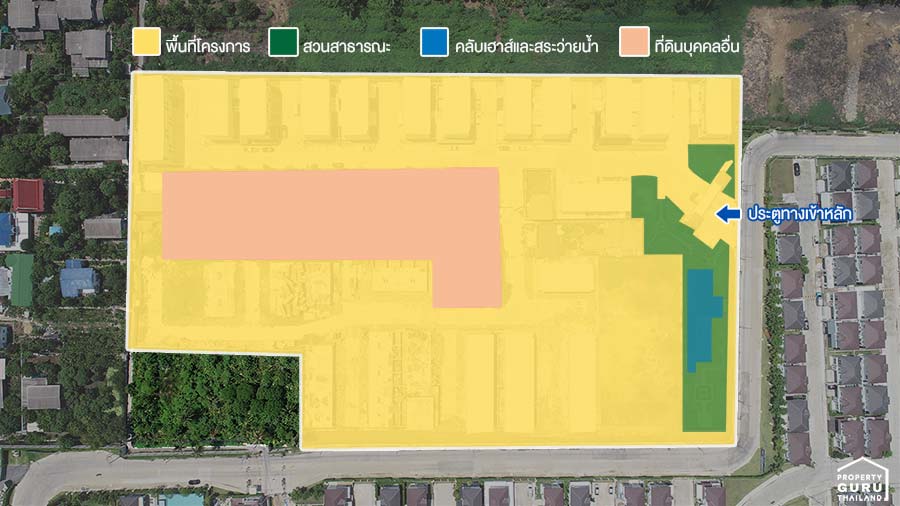 แสดงให้เห็นถึงขอบเขตโครงการโดยรวม สวนส่วนกลาง คลับเฮ้าส์ บ้านตัวอย่าง และทางเข้า-ออก
