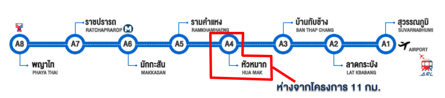 สำหรับรถไฟ้าสายปัจจุบันที่สามารถใช้ได้ คือ รถไฟฟ้า Airport Rail Link ที่สถานีหัวหมากจะใกล้กับโครงการที่สุด มีระยะทางประมาณ 11 กิโลเมตรค่ะ