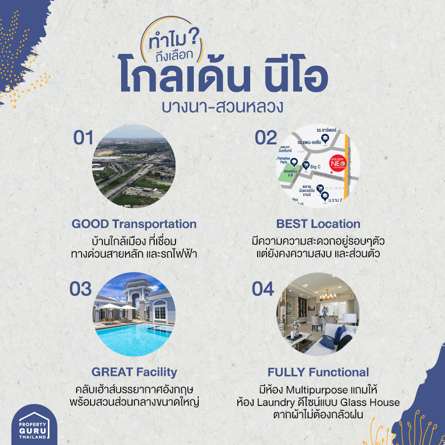 หากจะกล่าวถึงทำเลที่มีการเติบโตอย่างรวดเร็วในตลอดหลายปีที่ผ่านมา และยังคงเติบโตอย่างต่อเนื่องจนมาถึงปัจจุบันนี้ คงหนีไม่พ้น ทำเล "บางนา" ซึ่งทำเลนี้มีผู้ประกอบการด้านอสังหาริมทรัพย์เข้าไปลงทุนบนพื้นที่นี้กันอย่างหนาแน่น และหนึ่งในโครงการที่น่าสนใจ นั่นคือ "โกลเด้น นีโอ บางนา-สวนหลวง" บ้านที่ครบครันทั้งเรื่องการเดินทางที่สะดวก และได้คุณภาพชีวิตที่ดี เนื่องจากการคมนาคมที่ครอบคลุมทั่วทุกพื้นที่ "เข้าเมืองก็ง่าย - ออกเมืองก็ไม่ยาก" การเดินทางก็สามารถเดินทาง โดยรถยนต์ ซึ่งอยู่ใกล้กับทางด่วนถึง 3 เส้นทาง และเดินทางด้วยรถไฟฟ้า ย่านนี้ครบครันไปด้วยแหล่ง Shopping และ Community Mall ขนาดใหญ่ เช่น Mega Bangna, Central Bangna Seacon Square, Paradise Park) อีกทั้งยังมีโรงพยาบาลชั้นนำและสถานศึกษาให้เลือกหลากหลาย ในส่วนของโครงการก็ให้ความสำคัญเรื่องส่วนกลางที่ครบครับ สวยงาม ตัวบ้านที่อยู่อาศัยก็ให้ฟังก์ชันครบ และยังแถมฟังก์ชันพิเศษห้อง Laundry ดีไซน์แบบ Glass House มาให้อีกด้วย เราไปชมพร้อมกันเลยดีกว่าค่ะ ว่าโครงการนี้จะครบครันขนาดไหน และสะดวกยังไง?