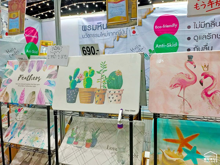 นอกจากนี้ยังมีที่รองแก้วน้ำทรงสี่เหลี่ยมซึ่งเป็นนวัตกรรมเดียวกันกับพรมหิน ราคา 80 บาท