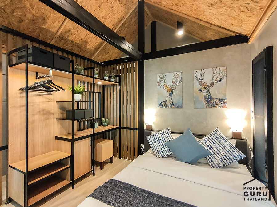 ชั้นบนเป็นห้องนอน วางเตียง 5 ฟุต แถมยังวางชั้นวางของได้อีก
