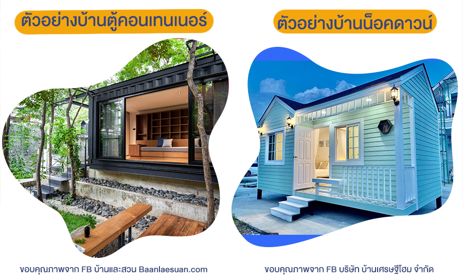 บ้านสำเร็จรูปที่นิยมกันในตอนนี้ จะมี 2 แบบด้วยกันค่ะ "บ้านน็อคดาวน์" และ "บ้านจากตู้คอนเทนเนอร์" ความแตกต่างที่เห็นได้ชัดของบ้านสำเร็จรูป 2 แบบนี้ก็คือวัสดุที่ใช้สร้างนั่นเองค่ะ ถ้าเป็น "บ้านน็อคดาวน์" วัสดุที่ใช้ในการก่อสร้างส่วนใหญ่จะเป็นเหล็ก หรือไม้ นำมาประกอบๆ กันเป็นรูปแบบบ้านแล้วแต่ดีไซน์ขึ้นมา แต่ถ้าหากเป็นบ้านจากตู้คอนเทนเนอร์ ชื่อก็บอกอยู่แล้วค่ะว่าสร้างมาจากตู้คอนเทนเนอร์ ที่ใช้ขนส่งสินค้านั่นเอง ซึ่งก็จะมีรูปแบบเป็นห้องเหลี่ยมๆ แบบทรงตู้คอนเทนเนอร์ แต่ก็มีความแข็งแรงมากทีเดียว อย่างไรก็ตาม ปัจจุบันก็มีการพัฒนาการสไตล์บ้านตู้คอนเทนเนอร์ให้สวยงามขึ้นมาไม่แพ้แบบบ้านทั่วไปอยู่เหมือนกันค่ะ