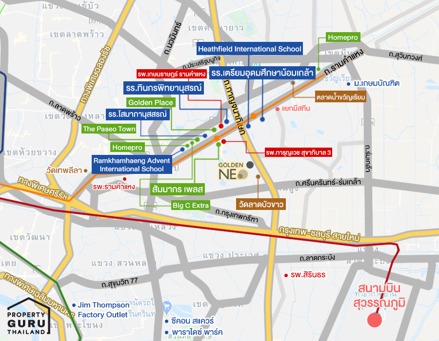การเดินทางสะดวก สบาย อยู่ใกล้ขนส่งสาธารณะที่หลากหลาย ทั้งถนนใหญ่, ทางด่วน, และรถไฟฟ้า ด้วยสมาชิกในครอบครัวหลายคน อาจจะต้องเดินทางหลายแบบ ตัวโครงการ โกลเด้น นีโอ พระราม 9 - กรุงเทพกรีฑา นั้นตั้งอยู่ในทำเลที่สามารถเดินทางได้ทั้งทางรถยนต์ และรถไฟฟ้า กับเส้นทางที่หลากหลาย และรวดเร็วได้ ดังต่อไปนี้