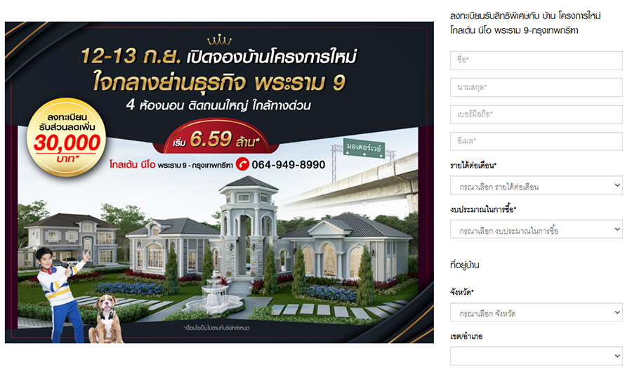 "โกลเด้น นีโอ พระราม 9 - กรุงเทพกรีฑา" เปิดให้จอง 12-13 กันยายน 2563 นี้ ในราคาเริ่มต้น 6.59 ล้านบาท ท่านใดที่สนใจสามารถเข้าไปลงทะเบียนรับสิทธิพิเศษ และรับส่วนลดเพิ่มทันที 30,000 บาท ได้ที่ลิงก์ด้านล่างนี้
