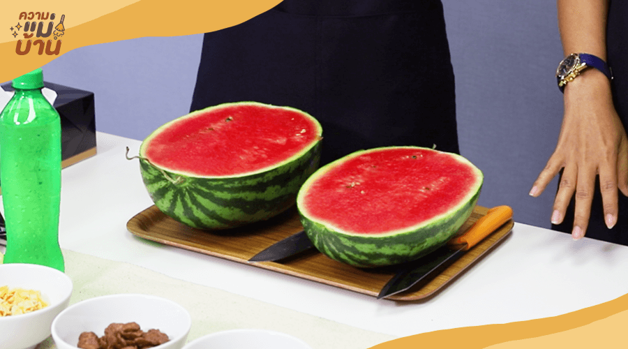 1. ผ่าแตงโมออกเป็น 2 ส่วน แกะเมล็ดออกจะได้ทานได้สะดวก ไม่เสียเวลาคายเมล็ด (หรือไม่แกะก็ได้ตามความชอบ)