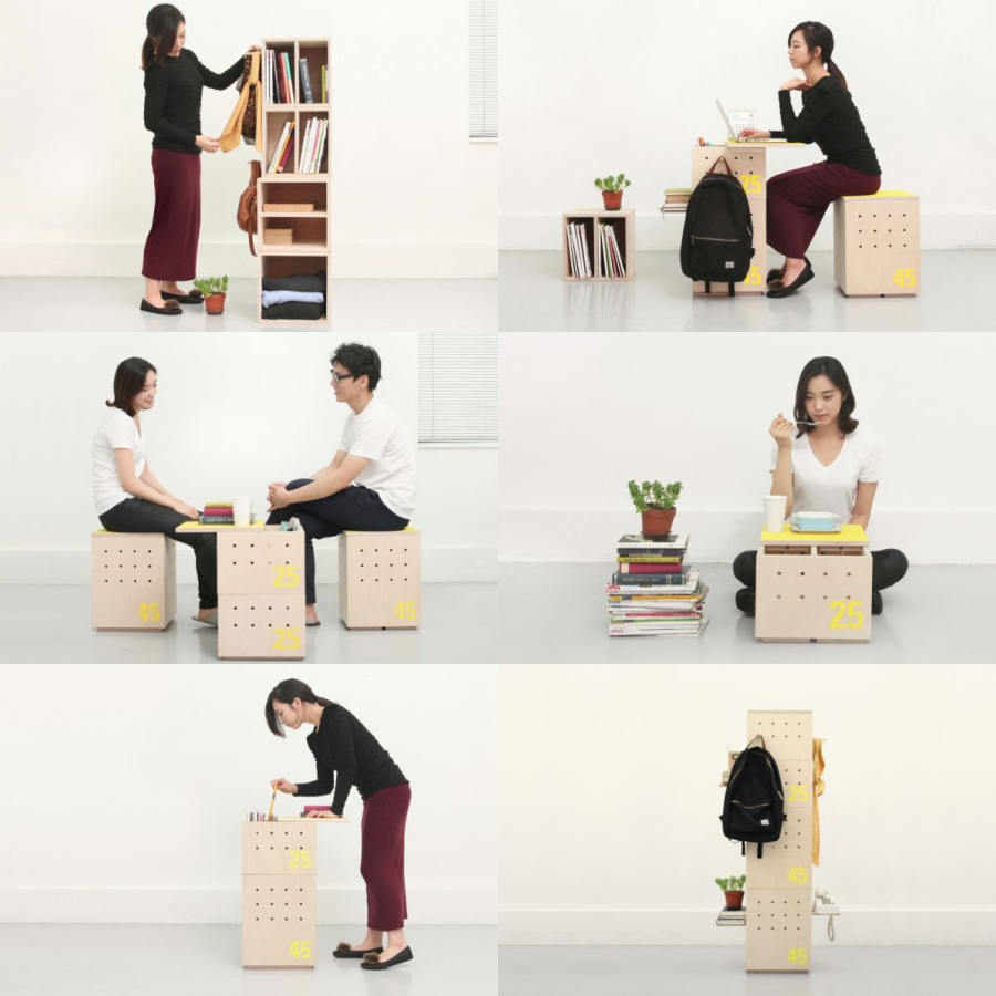 สำหรับพื้นที่ห้องเล็กๆ ภายในบ้านที่อาจจะมีพื้นที่วางเฟอร์นิเจอร์ได้ไม่มากนัก ไอเดียชั้นวางหนังสือแบบนี้ก็ประหยัดพื้นที่ไปได้เยอะทีเดียว ด้วยการออกแบบจากคุณ Gyuyub Jo ที่ได้แรงบันดาลใจมาจาก "กล่อง" มาดัดแปลงกับชั้นวางหนังสือให้มีหน้าตาเหมือนกล่องที่สามารถถอดชิ้นออกมาประกอบเป็นโต๊ะ เป็นม้านั่งได้โดยที่ยังสามารถวางหนังสือในชั้นได้อยู่ เหมาะกับห้องทำงานเล็กๆ ดีเหมือนกัน
