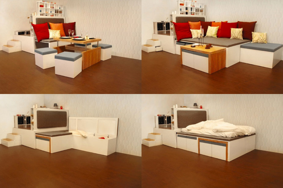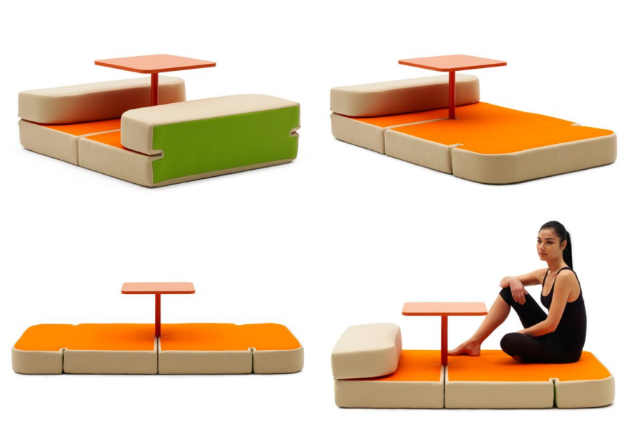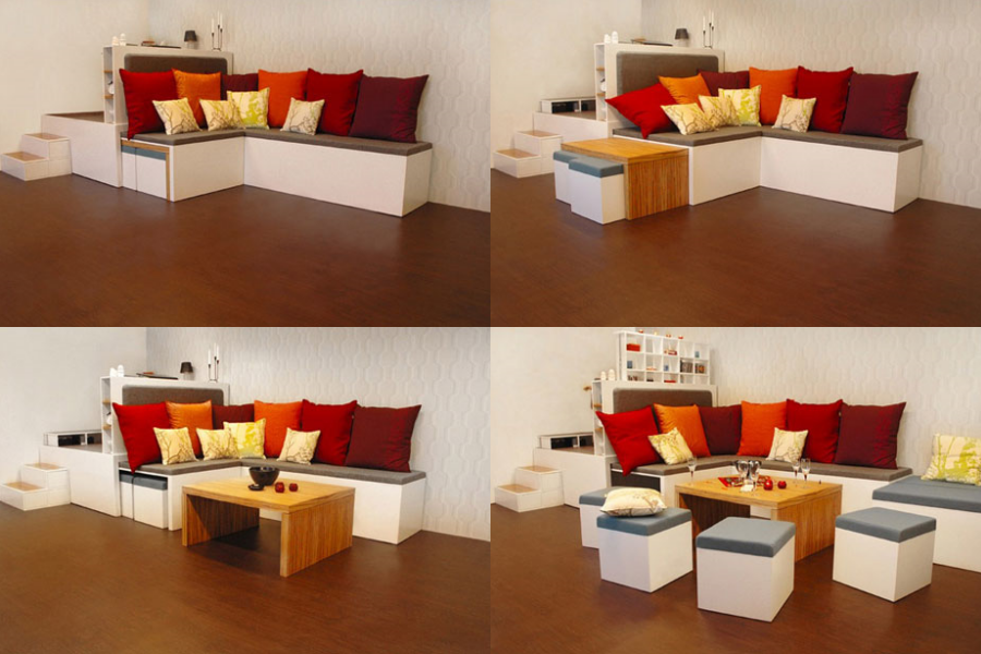 ไอเดียนี้มีชื่อว่า Matroshka ที่ออกแบบโดยชาวรัสเซีย สำหรับเฟอร์นิเจอร์ตัวนี้สามารถดัดแปลงได้หลายอย่างเลยทีเดียวจากตอนแรกที่เป็นเหมือนม้านั่งโซฟายาว นั่งได้ 5-6 คน ก็สามารถถอดชิ้นส่วนออกมา เพิ่มที่นั่งได้อีก 5 ที่นั่ง กลายเป็นที่นั่งสังสรรค์ ปาร์ตี้เล็กๆ ได้เลยทีเดียว แถมยังเปลี่ยนรูปทรงโต๊ะให้ยกสูงขึ้นมาได้อีกด้วย นอกจากนี้ยังสามารถแปลงร่างให้กลายเป็นเตียงนอนสบายๆ ได้เช่นกัน สารพัดประโยชน์จริงๆ