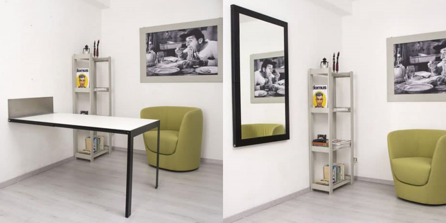 โต๊ะกระจกที่ไม่ได้ทำมาจากกระจก เพราะมันคือโต๊ะ และ กระจก ในตัวเดียวกันนั่นเอง สำหรับเฟอร์นิเจอร์ตัวนี้จะเหมาะกับชาวคอนโดที่มีขนาดห้องเล็กๆ สามารถติดตั้งไว้บริเวณส่วนที่เป็นครัวเพื่อประยุกต์เป็นที่นั่งรับประทานอาหารได้ เมื่อตอนที่เราไม่ได้ใช้ ก็พับเก็บไปกับผนัง กลายเป็นกระจก สารพัดประโยชน์ไปอีก