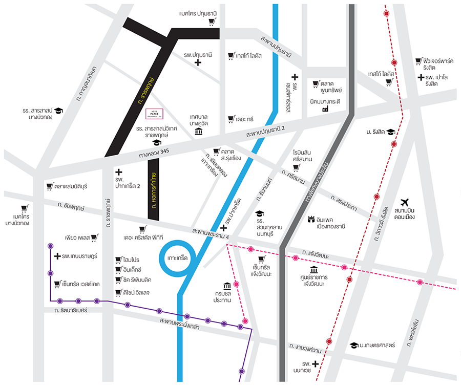 - ที่ตั้งโครงการ : ถนนเลียบคลองเกาะเกรียง ตำบลบางคูวัด อำเภอเมืองปทุมธานี จังหวัดปทุมธานี 12000 (