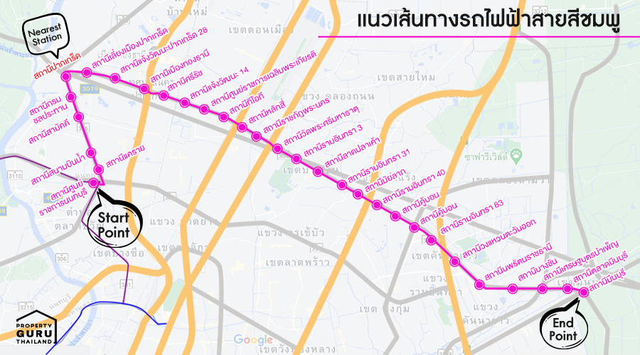 แนวเส้นทางรถไฟฟ้าสายสีชมพู มีทั้งหมด 30 สถานี เชื่อมต่อสายสีม่วง และสายสีน้ำเงิน