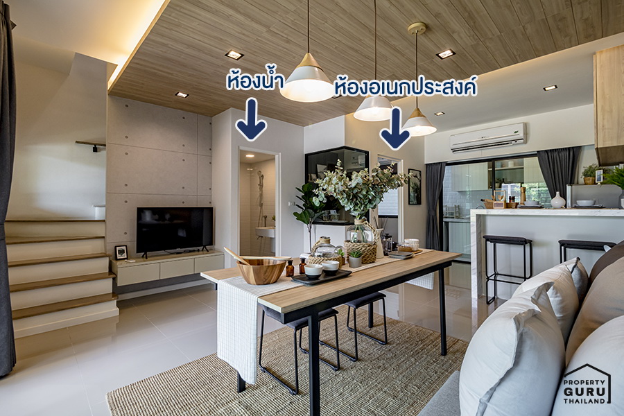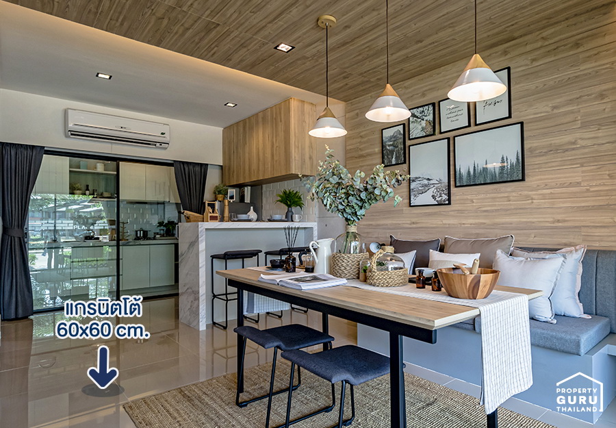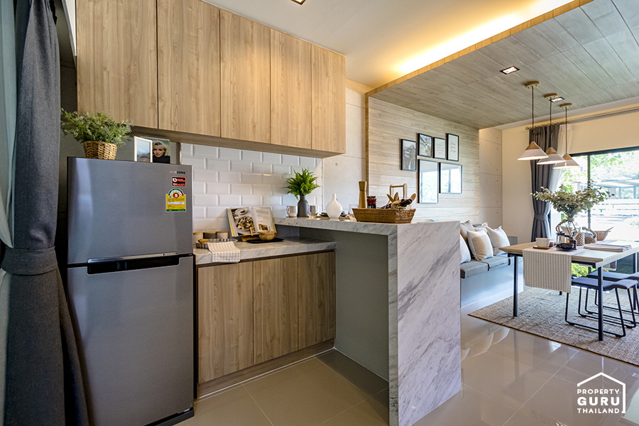 ลึกเข้าไปในบ้าน จะเป็นพื้นที่สำหรับรับประทานอาหาร บ้านตัวอย่างออกแบบให้ห้องครัวอยู่บริเวณพื้นที่ซักล้าง ซึ่งต้องต่อเติมเพิ่ม แล้วทำส่วนนี้เป็น Pantry เล็กๆ สำหรับเตรียมอาหารเบาๆ และโต๊ะนั่งรับประทานอาหาร