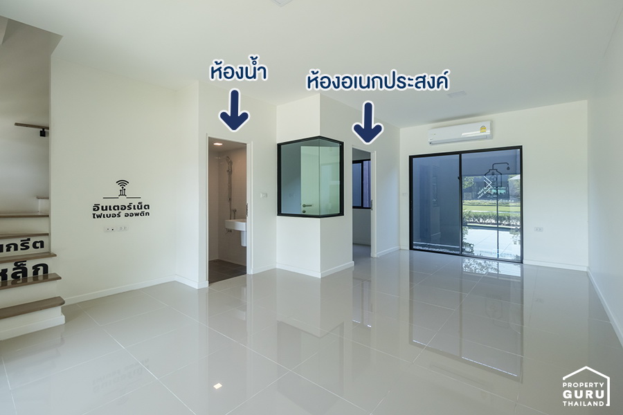 รายละเอียดของบ้านชั้น 1 เป็นแบบนี้ค่ะ ด้านในมีห้องน้ำ และห้องอเนกประสงค์ เป็นห้องเปล่าที่โครงการกั้นห้องไว้ให้เลย สามารถออกแบบเป็นห้องทำงาน หรือเป็นห้องนอนสำหรับผู้สูงอายุก็ได้ค่ะ