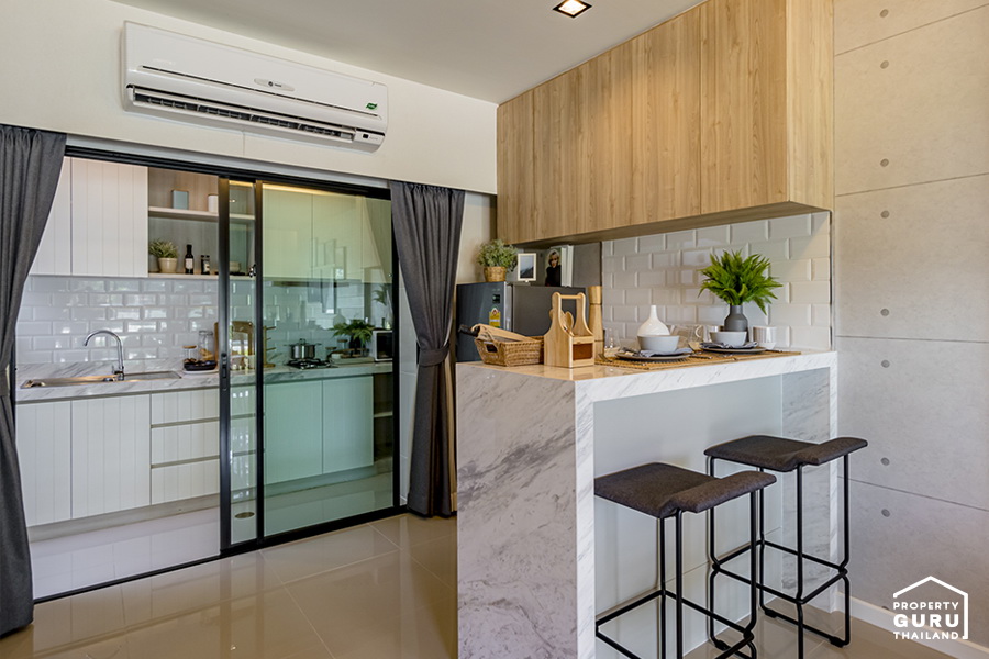 Pantry เล็กๆ และโต๊ะรับประทานอาหารแบบเคาน์เตอร์ หรือใครอยากจะทำเป็นครัวไทยตรงนี้ไปเลย ก็ได้เช่นกันค่ะ