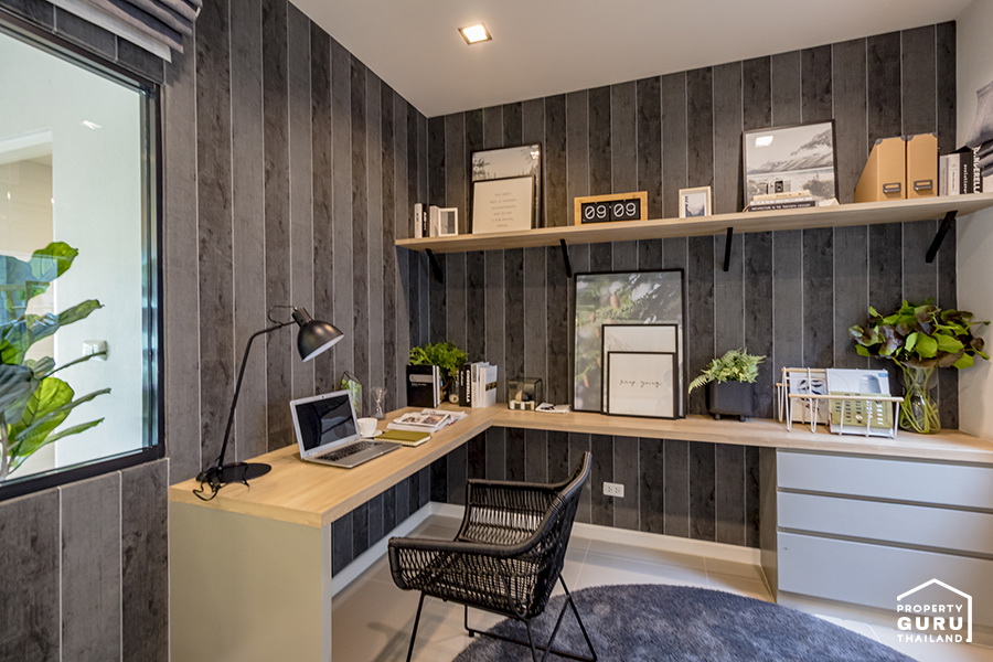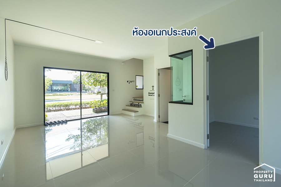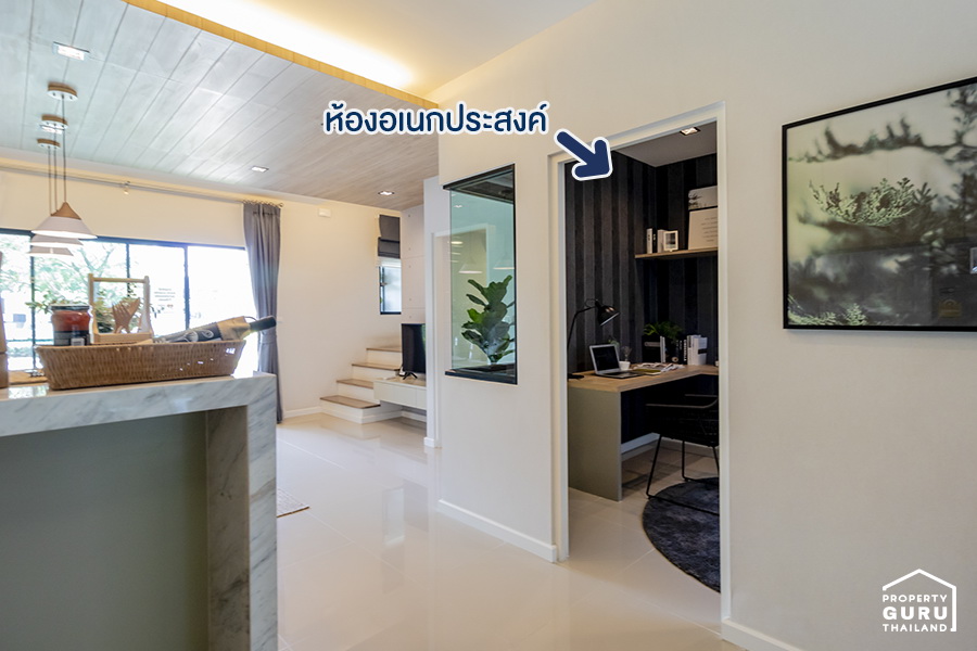 เข้ามาส่องในห้องอเนกประสงค์หน่อย โครงการแต่งไว้เป็นห้องทำงาน ซึ่งของจริงก็จะได้เป็นห้องเปล่าๆ ค่ะ แต่ถ้าอยากทำเป็นห้องนอนผู้สูงอายุ ก็จะเท่ากับว่าเราได้บ้านที่มี 4 ห้องนอนเลยทีเดียว