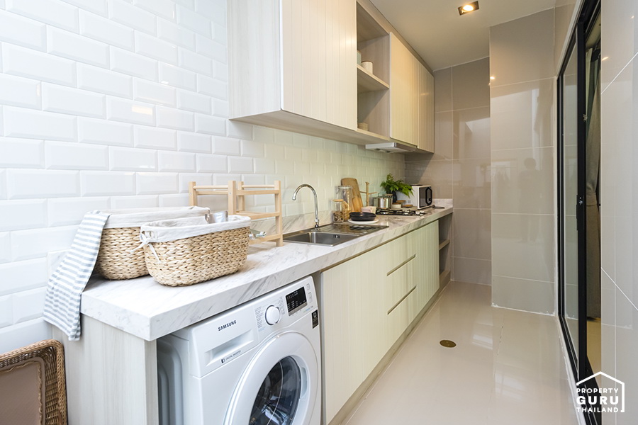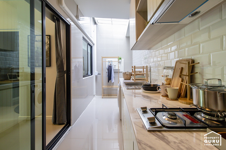 สำหรับพื้นที่ซักล้างของบ้านตัวอย่าง โดนแปลงให้เป็นห้องครัวแบบนี้ ก็ดูดีเหมือนกันนะคะ