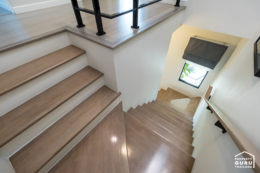 เตรียมตัวขึ้นไปชั้นบนกันค่ะ บันไดโครงการเป็นคอนกรีตเสริมเหล็กแบบนี้ พอขึ้นไปข้างบน เพดานก็จะมีช่องรับแสง