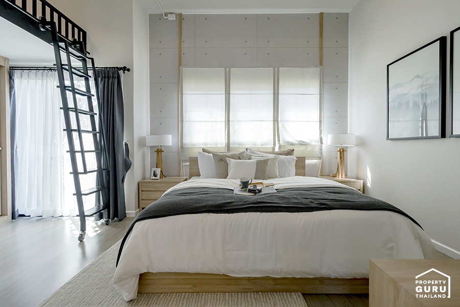 เข้ามาดู Master Bedroom กันก่อนเลย จุดเด่นอีกอย่างของบ้านก็คือการที่ Master Bedroom นั้นมีความสูงจากพื้นถึงฝ้าถึง 3.7 เมตร เลยทีเดียว ก็จะทำให้ห้องดูโปร่งโล่งเป็นพิเศษ