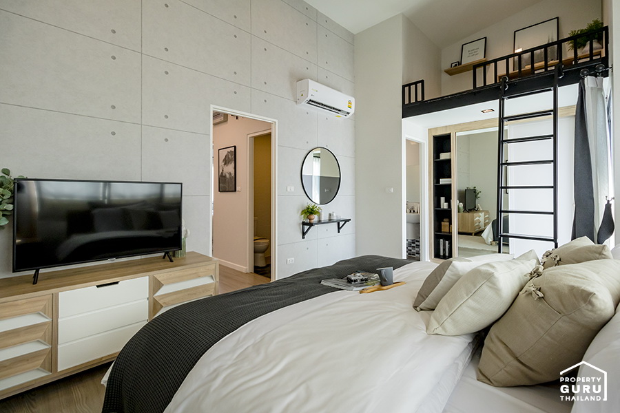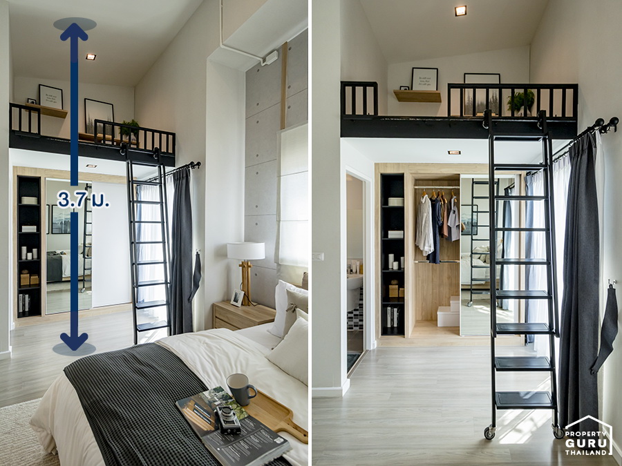 ด้วยความสูง 3.7 เมตร ทำให้สามารถแต่งให้เป็นห้องสไตล์ Loft ได้ โครงการตกแต่งไว้ให้ดูเป็นตัวอย่างแบบนี้ค่ะ