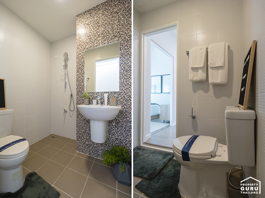 ห้องน้ำชั้นล่างจะไม่ได้แบ่งส่วนแห้งส่วนเปียก แต่ได้ฟังก์ชันที่ครบก็ถือว่าใช้ได้แล้วค่ะ