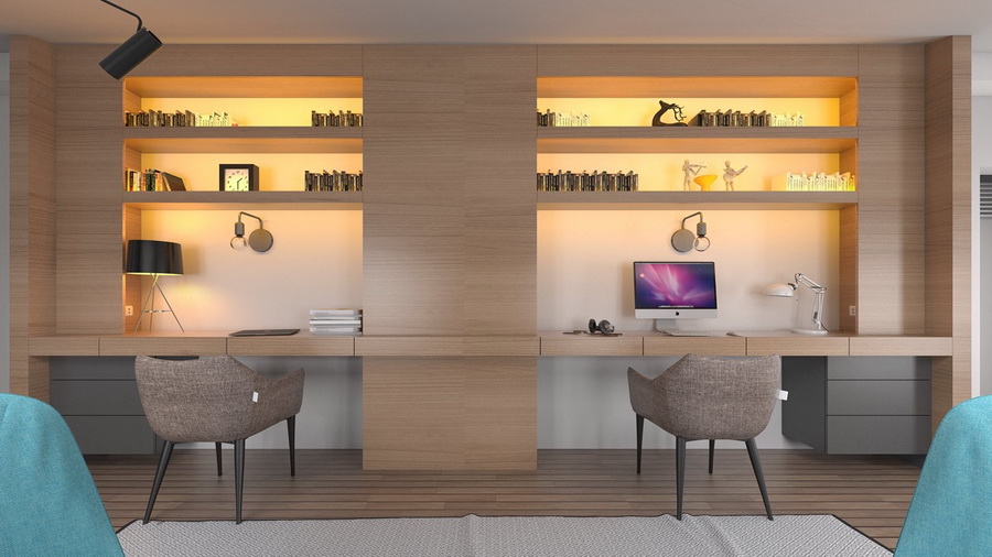 ห้องทำงานกึ่งโต๊ะประชุม พร้อมชั้นวางของเพิ่มความสะดวกสบาย