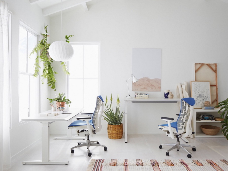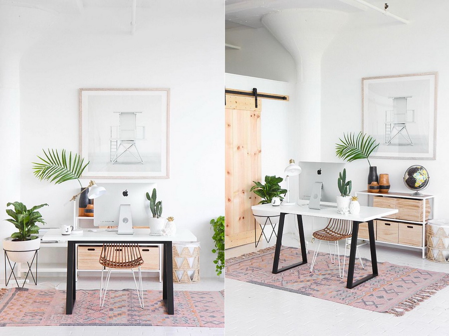 โต๊ะนั่งทำงานเดี่ยวสไตล์สแกนดิเนเวี่ยน แต่งด้วยต้นไม้สีเขียวดูสบายตา