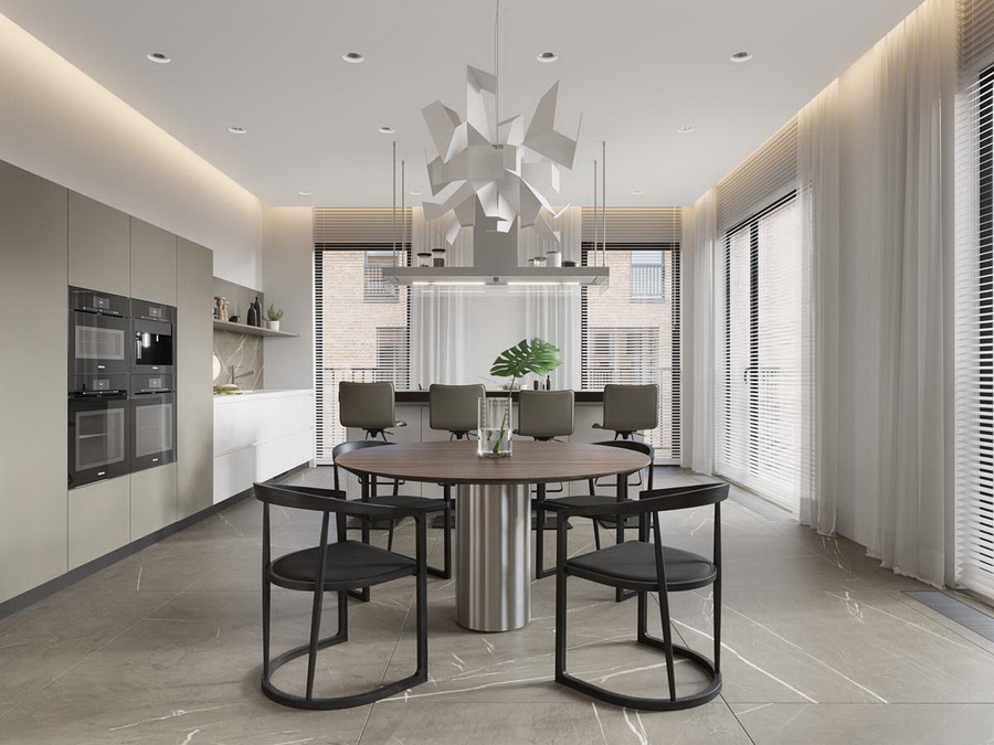 ในโฮมออฟฟิศก็ต้องมีโซนห้องครัว แต่งห้องครัวสไตล์โมเดิร์น พร้อมโต๊ะนั่งรับประทานอาหารสำหรับพนักงาน