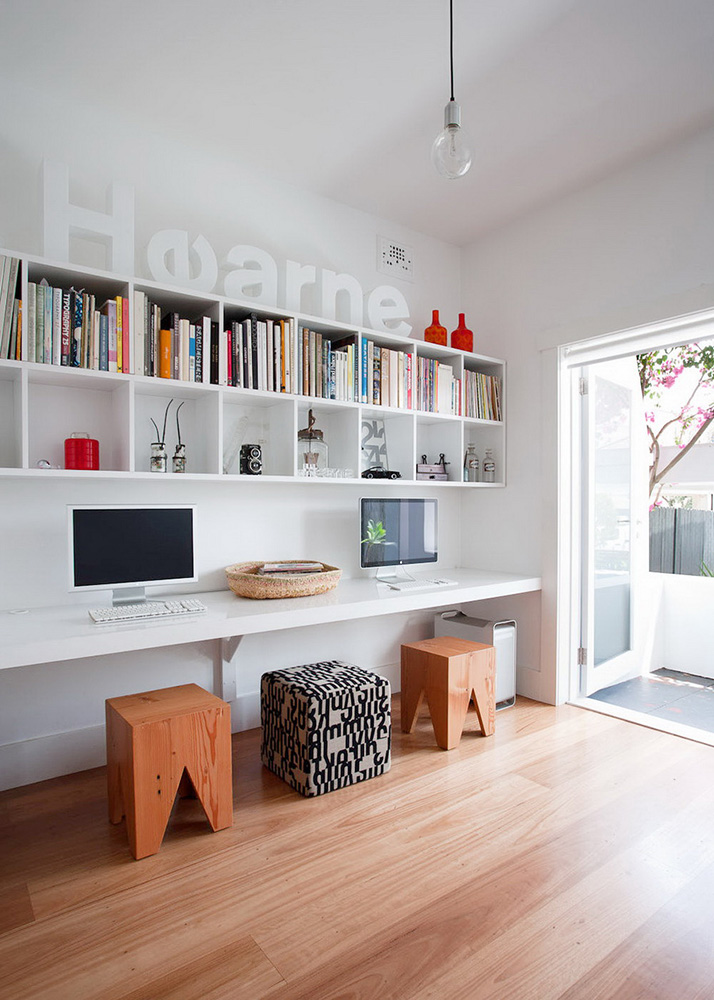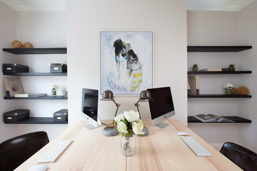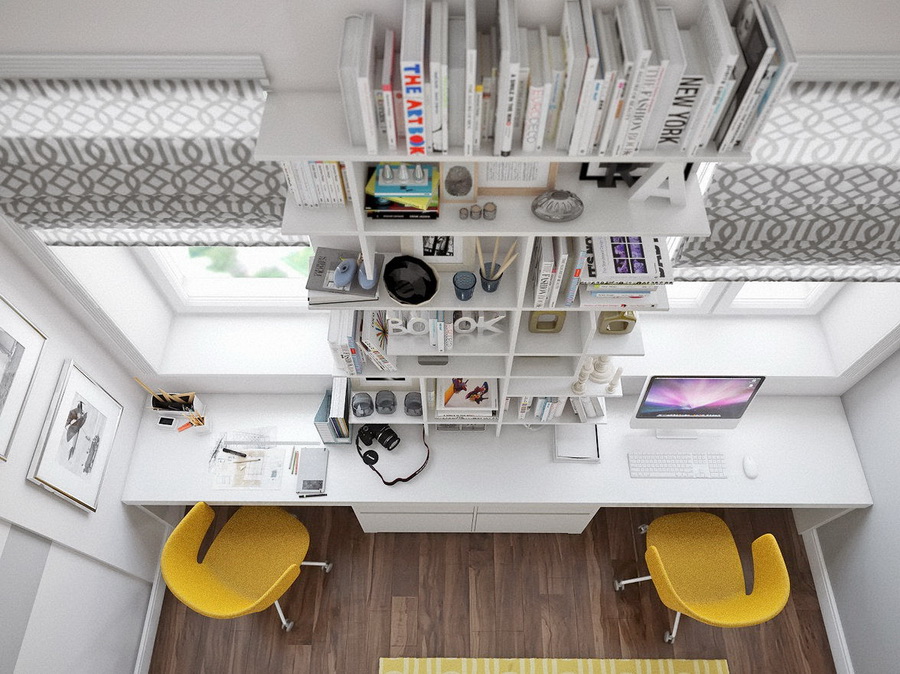 โฮมออฟฟิศเพดานสูง แต่งชั้นวางของให้สูงจรดเพดานเพื่อความเก๋กันไปเลย