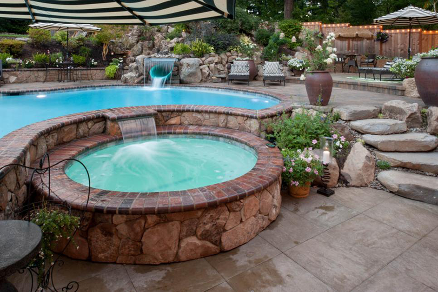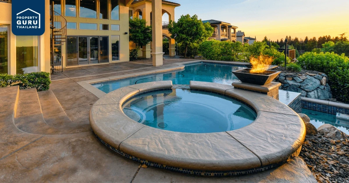 อ่างจากุชชี่ ข้างๆสระว่ายน้ำ ในสวนหลังบ้าน