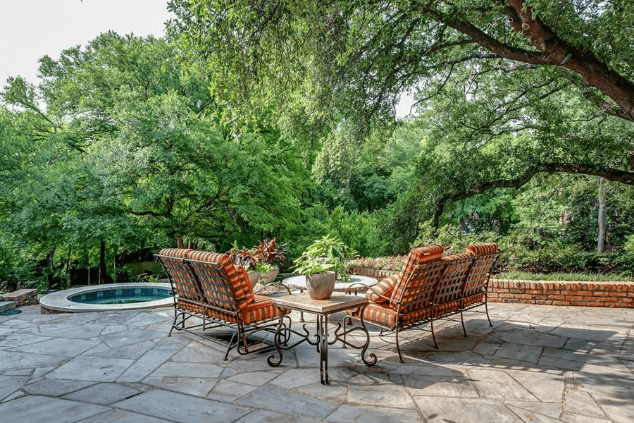 โซฟาพักผ่อนในสวนหลังบ้าน กับอ่างแช่ตัววิวสีเขียวของต้นไม้ใหญ่
