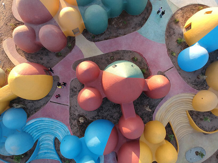 โดยหมู่บ้านคัลเลอร์ฟูลแห่งนี้ประกอบด้วยโดมขนาดเล็กจำนวนมากที่สร้างขึ้นด้วยเทคนิค superadobe ที่คิดค้นขึ้นโดย Nader Khalili สถาปนิกชาวอิหร่าน ซึ่งโดมขนาดเล็กๆ เหล่านี้เป็นโดมที่ทำได้ไม่ยาก จึงทำให้ช่างในท้องถิ่นและชาวบ้านที่ไม่ได้มีทักษะในการก่อสร้างสามารถร่วมแรงร่วมใจกันทำได้ สีที่นำมาใช้ก็ได้อ้างอิงสีที่มีอยู่ในธรรมชาติของพื้นที่ รูปทรงโดมที่เป้นลักษณะเด่นของหมู่บ้านนี้ก็ได้รับแรงบันดาลใจมาจากลักษณะภูมิประเทศของเกาะฮอร์มุซนั่นเอง
