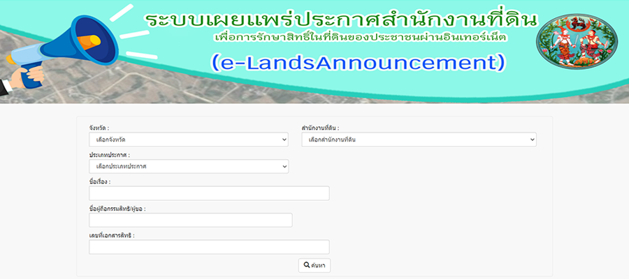 การใช้งานการตรวจสอบประกาศสำนักงานที่ดินสามารถเข้าไปที่เมนู "ค้นหาประกาศที่ดิน" (e-LandsAnnouncement)