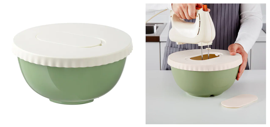 ชามผสมพร้อมฝาสีเขียว ความจุ 4 ลิตร บนฝามีช่องเปิดได้ ช่วยให้คนผสมอาหารได้โดยไม่กระเด็น ส่วนขอบยางด้านล่างช่วยยึดชามไม่ให้เลื่อนไปเลื่อนมา