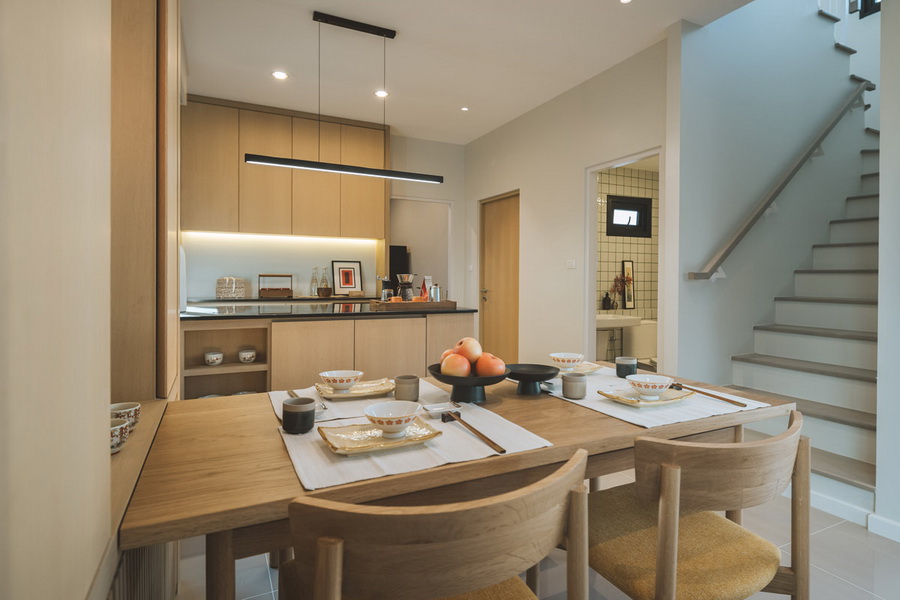 ห้องครัว Built-in เคลือบผิวหน้าด้วยไม้ พร้อมกับชุดโต๊ะรับประทานอาหารไม้ด้วยเช่นกัน