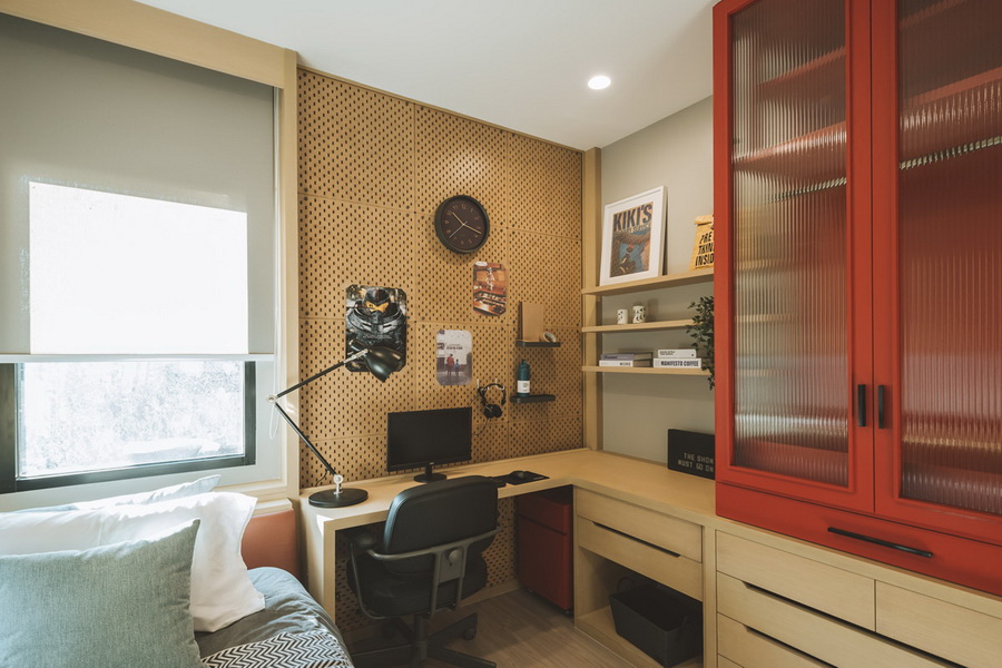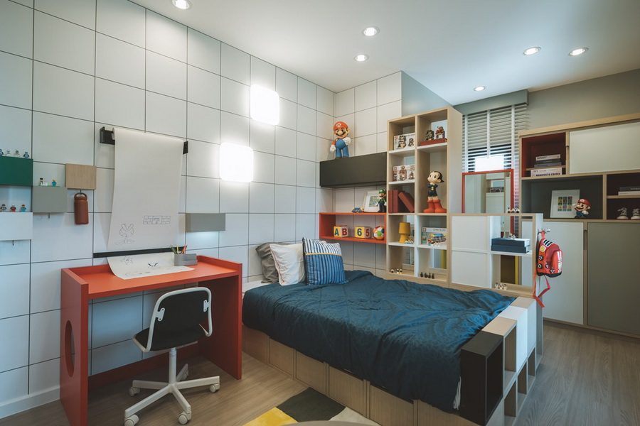 ห้องนอนเล็ก ที่ใช้เป็นห้องนอนเด็กๆ อาจจะมีการเติมสีสันที่โดดเด่นขึ้นมาให้ไม่น่าเบื่อเกินไป