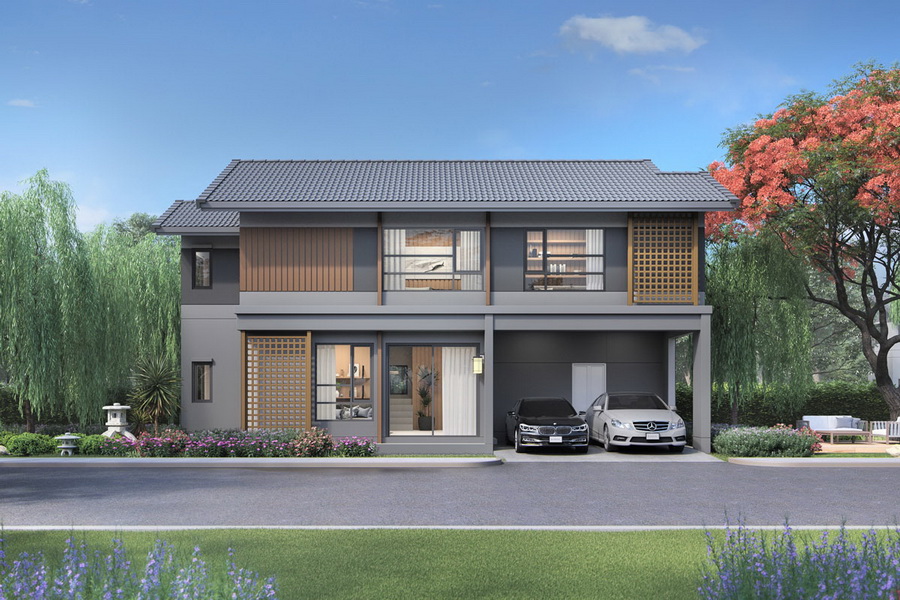 จากแบบบ้านจะเห็นได้ว่า เขาใช้สีบ้านเป็นสีเอิร์ธโทนตามหลักบ้านญี่ปุ่นเลยค่ะ แต่ดีไซน์อาจจะมีการปรับให้ดูโมเดิร์น แต่ก็ยังแฝงไปด้วยกิมมิกแบบญี่ปุ่นด้วยระแนงไม้เป็นลูกเล่นสวยๆ ส่วนภายในแปลนบ้านก็มีการผสมผสานให้เข้ากับการใช้ชีวิตของคนไทย ในบรรยาากาศแบบญี่ปุ่นๆ นั่นเองค่ะ