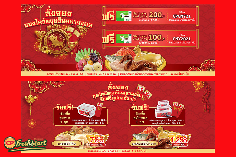 Fresh Mart ร้านค้าในเครือ CP ก็เป็นอีกเจ้าที่ขายของตามเทศกาล ส่วนใหญ่จะขายเป็นของสดเช่น ไก่ไหว้เจ้า เป็ดย่าง ปลากระพง ขายทั้งแบบเป็นชุด และแยกกัน มีให้เลือกหลายแบบ และยังลดราคาพิเศษอีกด้วยค่ะ