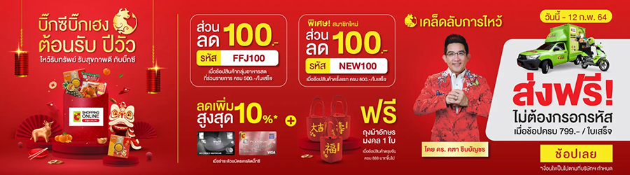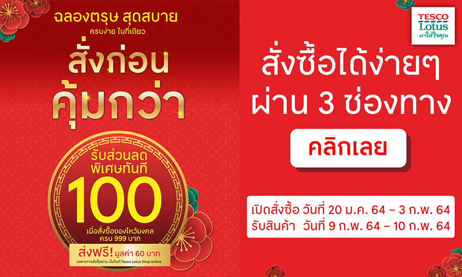 Tesco Lotus ออนไลน์เขาก็ไม่พลาดเช่นกันค่ะ ยกขบวนของไหว้เจ้าออกมาให้สั่งซื้อออนไลน์กันได้ง่ายๆ อีกทั้งยังมีโปรโมชั่นพิเศษส่วนลด 100 บาท เมื่อสั่งซื้อของไหว้มงคลครบ 999 บาท และยังฟรีค่าส่งอีก 60 บาสำหรับการสั่งซื้อออนไลน์ผ่านเว็บไซต์เท่านั้น มีทั้งชุดซาแซ เป็ด ไก่ ขาหมู ผลไม้ไหว้เจ้า และยังมีของใช้พวก อั่งเป่า ชุดไหว้มหามงคลต่างๆ ให้เลือกมากมาย ต้องรีบหน่อยนะคะ เขาเปิดให้สั่งถึงแค่วันที่ 3 กุมภาพันธ์ 2564 นี้เท่านั้น