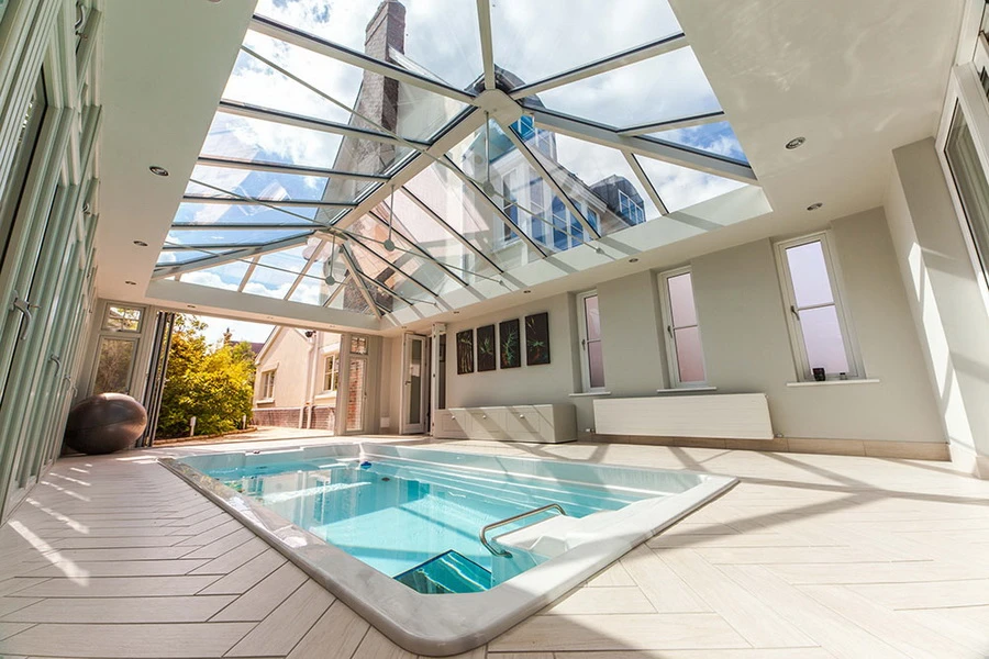 ถ้าหากพอมีพื้นที่ข้างบ้าน ก็สามารถต่อเติมหลังคาและทำสระว่ายน้ำแบบนี้ได้ ถึงจะเป็น Indoor แต่ก็ออกแบบให้หลังคาเป็นเรือนกระจกที่สามารถรับแสงธรรมชาติได้