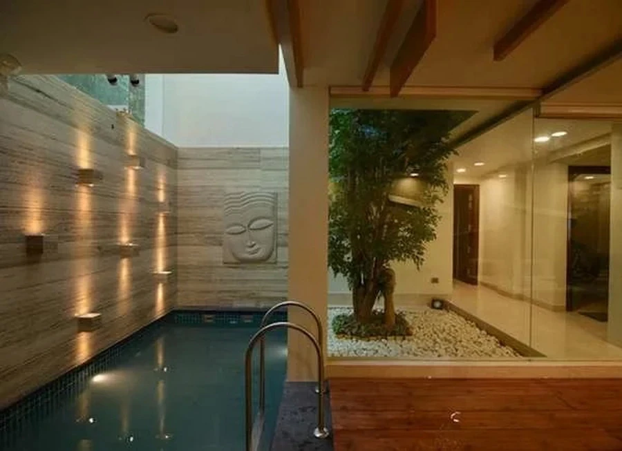 สระว่ายน้ำ ในพื้นที่เล็กๆ ของบ้าน ที่ช่วยผ่อนคลายในวันสบายๆ ถ้าวางอโรม่าไว้ด้วยก็เหมือนอยู่สปาเลยทีเดียว