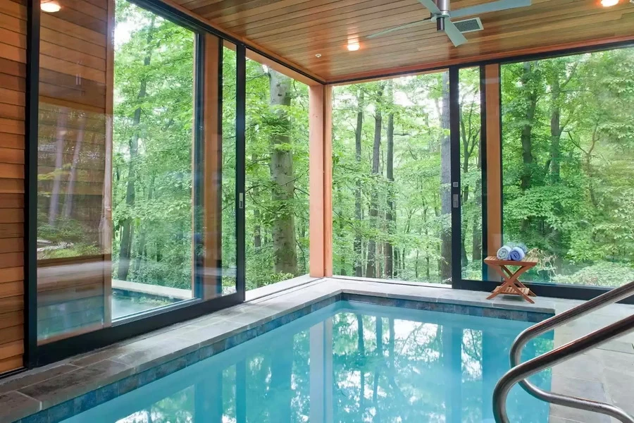 สระว่ายน้ำนอกบ้าน แต่อยู่ในพื้นที่แบบ Indoor สามารถมองเห็นวิวธรรมชาติ พื้นที่หลังบ้าน ว่ายไปก็ผ่อนคลายไป