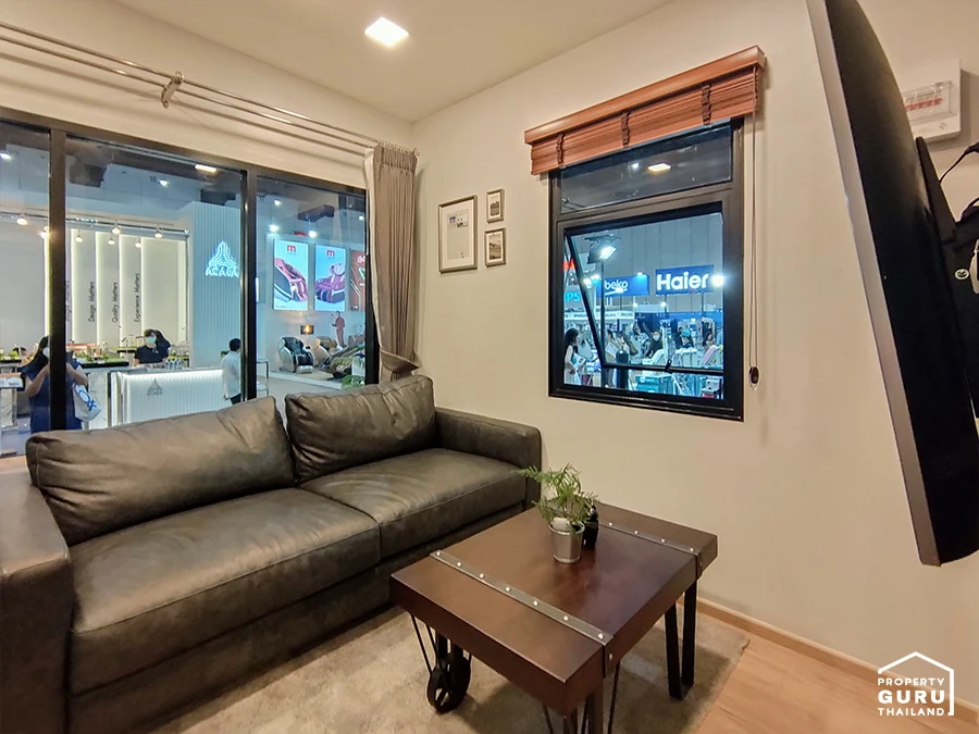 แต่ภายในฟังก์ชั่นจัดเต็มมากค่ะ ห้องนั่งเล่นที่อยู่โซนด้านหน้า วางโซฟา 2 ที่นั่งแบบนี้