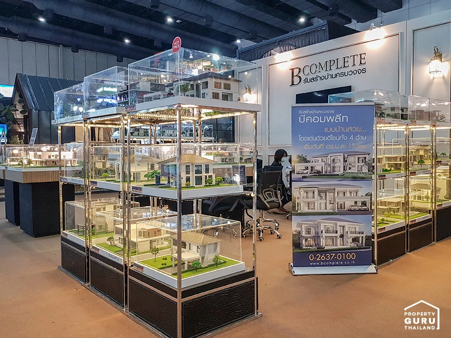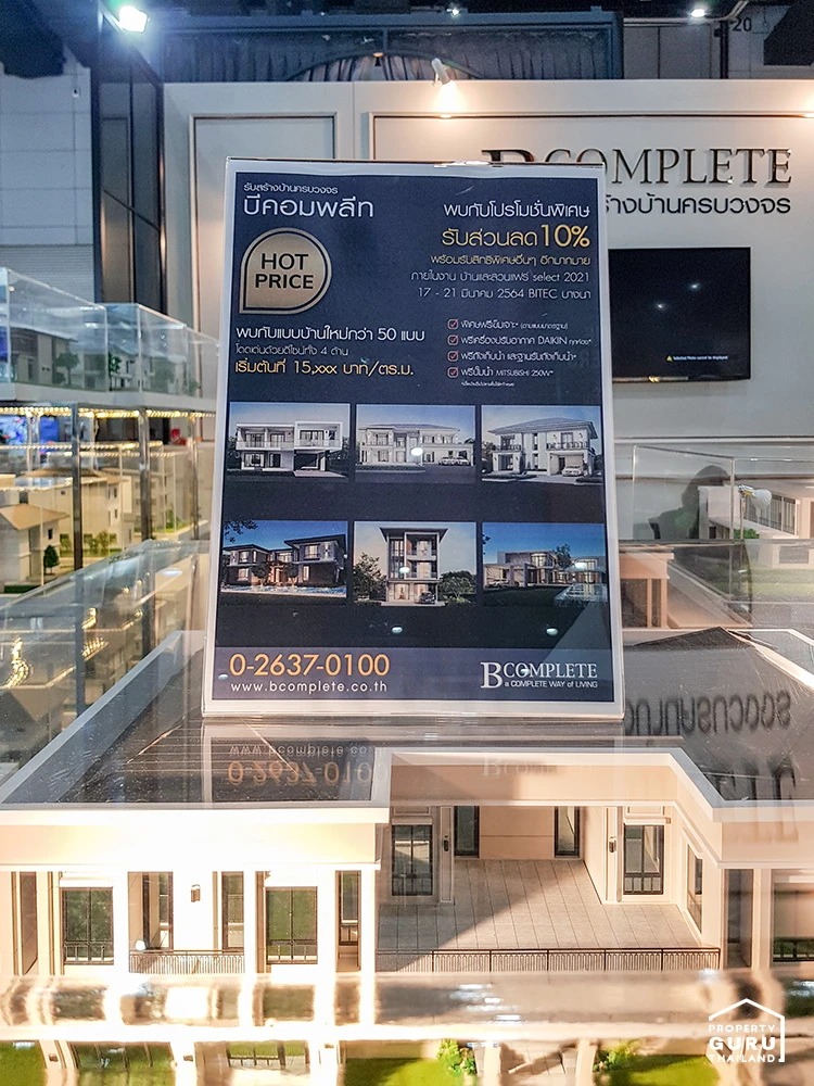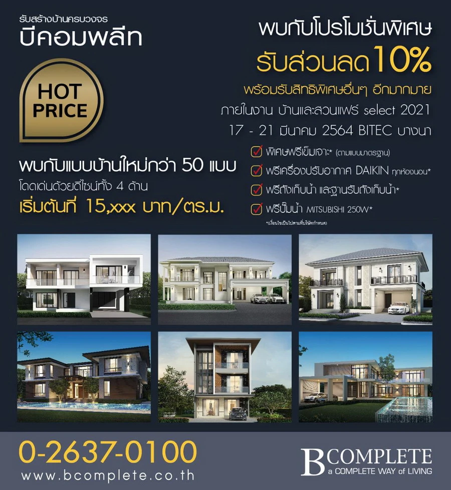 B Complete บริษัทรับสร้างบ้าน โดยโมเดลบ้านที่เอามาแสดงในงาน จะเป็นบ้านสไตล์โมเดิร์นที่มีพื้นที่ใช้สอยค่อนข้างกว้างทีเดียวค่ะ ราคาเริ่มต้นที่ 15,xxx บาท/ตร.ม. ดีไซน์สวยงาม ทันสมัย อีกทั้งยังมีโปรโมชั่นภายในงานด้วยเช่นกันค่ะ ไม่ว่าจะเป็น รับส่วนลด หรือรับสิทธิพิเศษอื่นๆ ซึ่งจะมีภายในงานเท่านั้นค่ะ