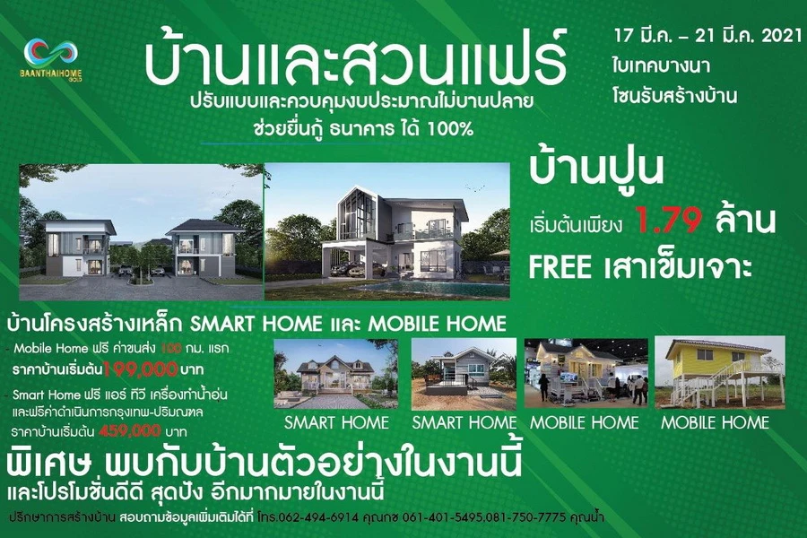 ศูนย์รับสร้างบ้าน "บ้านไทยโฮม โกลด์" เขารับสร้างตั้งแต่บ้านจัดสรร อาคารพาณิชย์ คอนโด หอพัก ไปจนบ้านน็อคดาวน์ก็รับค่ะ โดยในงานบ้านและสวนแฟร์ Select 2021 เขาได้เอาตัวอย่างบ้านน็อคดาวน์หลังหนึ่งมาแสดงที่งาน อีกทั้งยังมีโปรโมพิเศษที่มีเฉพาะในงานเท่านั้นอีกด้วยค่ะ