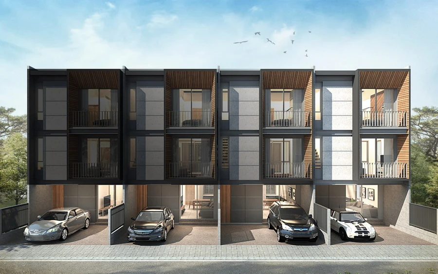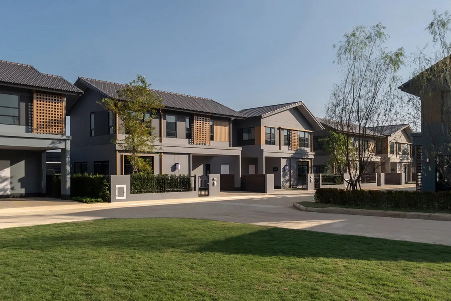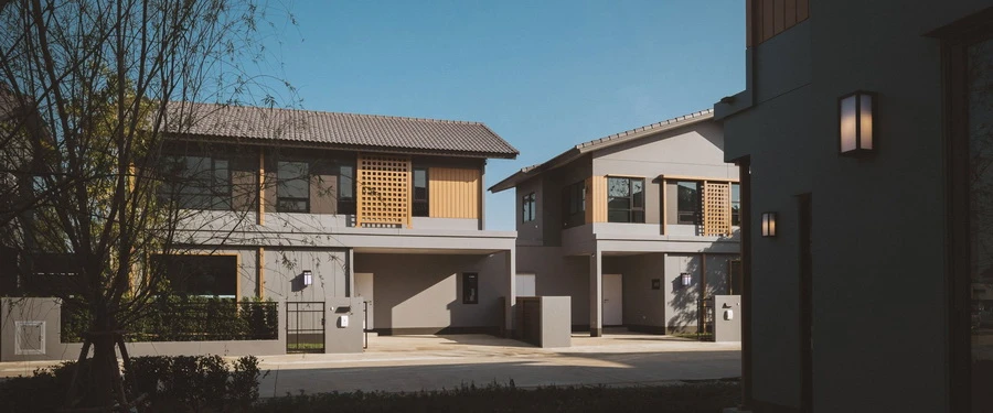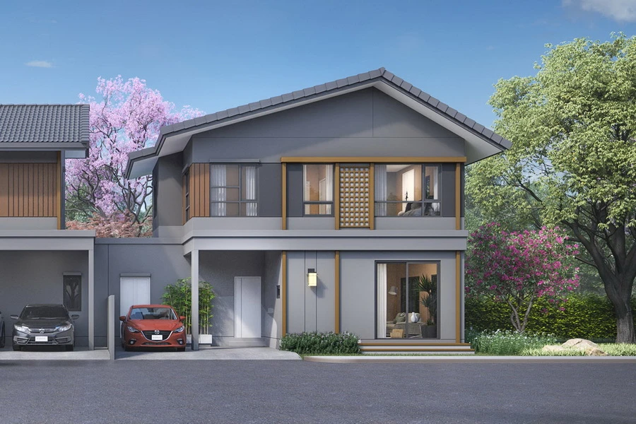 ตัวแบบบ้าน ที่มีทั้งบ้านแฝด และบ้านเดี่ยว คุมโทนสีบ้านให้ออกมาเป็นเอิร์ธโทน ดูอบอุ่น